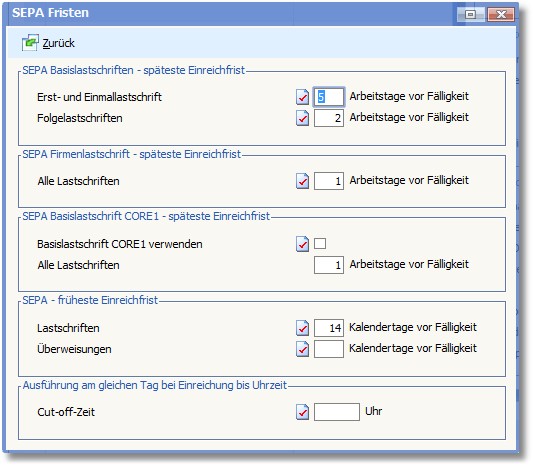 In diesem Dialogfenster sind die Fristen für SEPA Firmen- und Basislastschriften zu hinterlegen:
