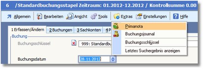 Navigation:  Finanzbuchhaltung > Stapelbuchungen > Die Karteikarte "Buchungen" > Buchungserfassung > Die Karteikarte "Erfassen/Ändern" > Buchungen bearbeiten - Menü >