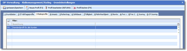 In der Tabelle dieser Karteikarte sind alle bereits hinterlegten Risikoprofile ersichtlich und können mit [RETURN] auf dem jeweiligen Risikoprofil bearbeitet werden.