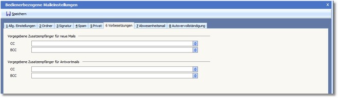 In dieser Karteikarte können Sie die Felder CC mit zusätzlichen Empfängern und BCC mit Empfängern, welche für die anderen Empfänger nicht sichtbar sind, vorbelegen. Dabei können Sie neuen Mails und Antwortmails jeweils unterschiedliche Einstellungen festlegen.