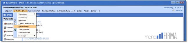1. Klicken Sie mit der Maus im Hauptmenü auf "CRM/OfficePlaner > Wiedervorlage".