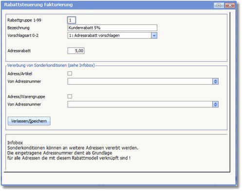 Der nun folgende Maskenbereich dient zur Vererbung von Sonderkonditionen einer bestimmten Adresse. Werden Adressen mit dieser Rabattgruppe verknüpft, so werden die Sonderkonditionen der hier hinterlegten Adressnummer angewendet. Folgende Felder werden für diese Funktionalität bereitgestellt: