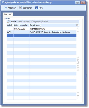 Das Programm öffnet die vorgelagerte Auswahltabelle der Werbetexte. Hier werden alle bereits angelegten Werbetexte angezeigt.