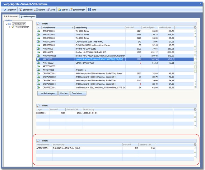 Die Auswahltabelle der Alternativartikel wird nun im unteren Tabellenbereich angezeigt.