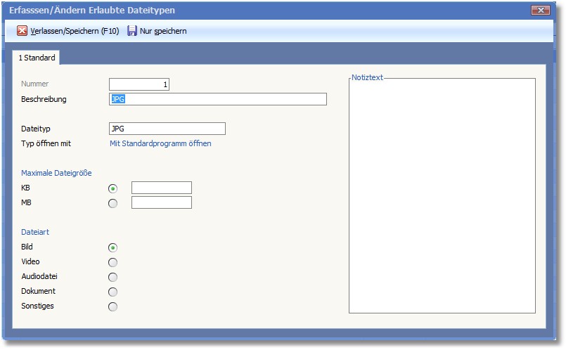 Bei der Erfassung eines erlaubten Dateitypen sind folgende Felder auszufüllen: