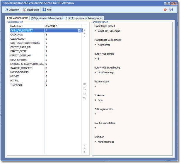<< Hier KLicken um eine Inhaltsübersicht anzuzeigen >> Navigation: Warenwirtschaft > Extras > Shopmanager > Marketplaces > Afterbuy > Marketplace verwalten > Umsetzungstabellen > Zahlarten |