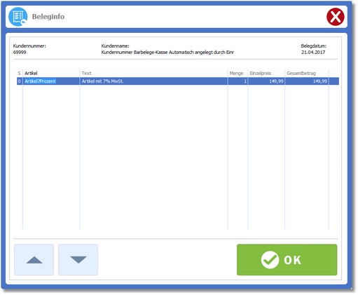 Das Programm öffnet eine Auswahltabelle mit den Belegen des heutigen Tages.