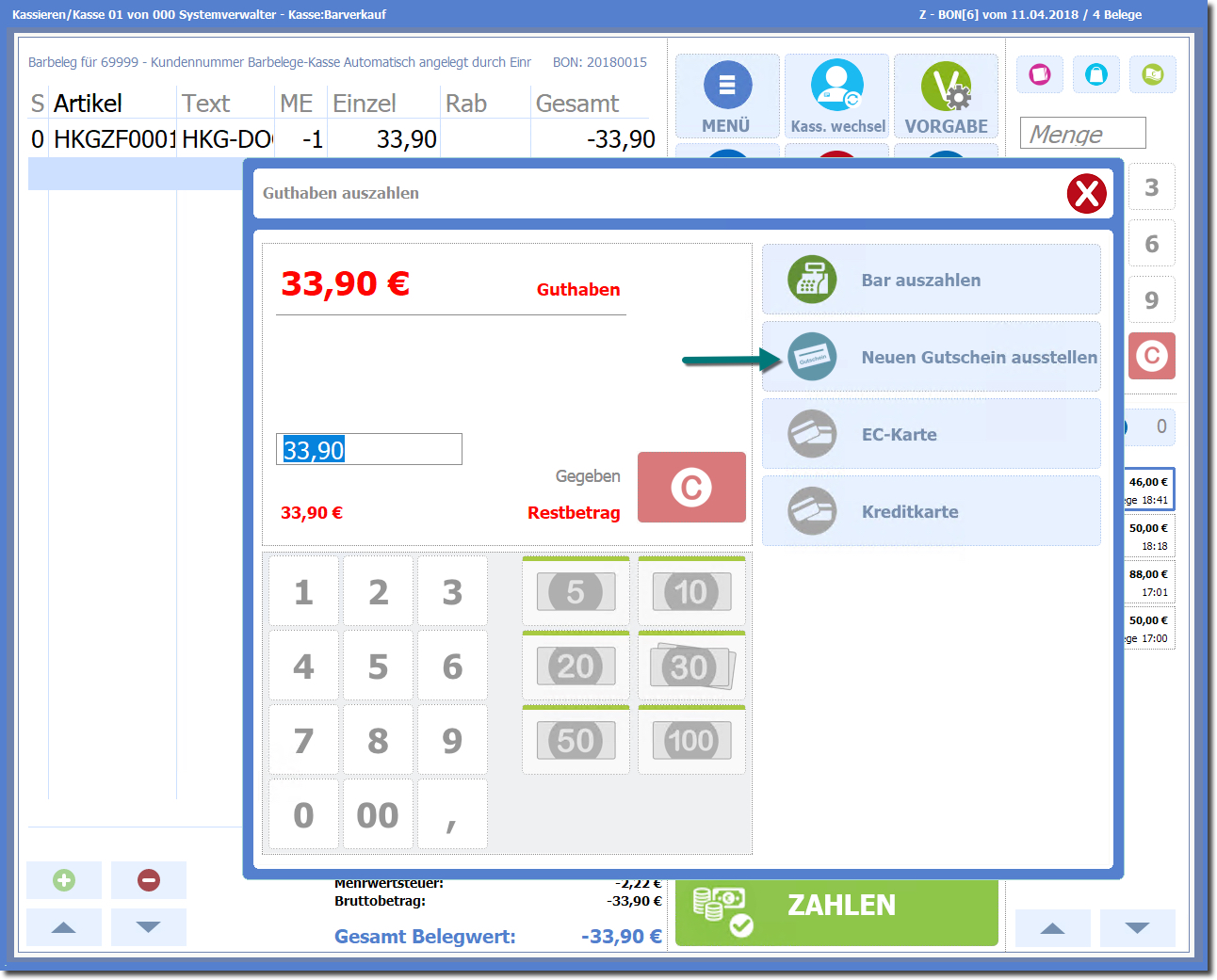 Wenn Sie den BON mit "Zahlen" abschließen, erhalten Sie eine Abfrage, ob das Guthaben als Gutschein ausgestellt werden soll.