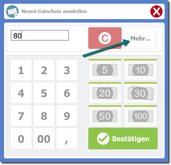 Im Fenster für die Betragseingabe finden Sie die Schaltfläche "Mehr".