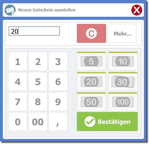 Nutzen Sie die Tastatur, den Nummernblock des Touchscreens (1) oder die "Geldscheinschnellwahltasten" (2), um den Gutscheinbetrag festzulegen.