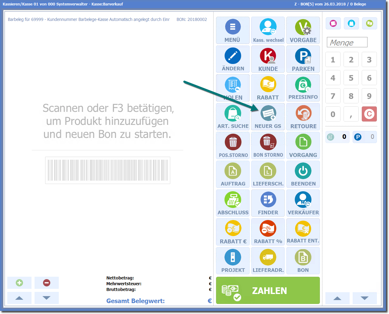 Den Verkaufsvorgang schließen Sie wie gewohnt mit "Zahlen" ab.
