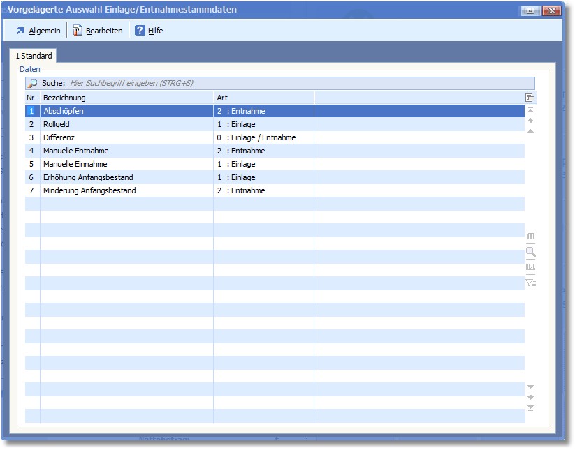 In der vorgelagerten Auswahltabelle werden alle bisher erfassten Einlage-/Entnahmearten angezeigt.