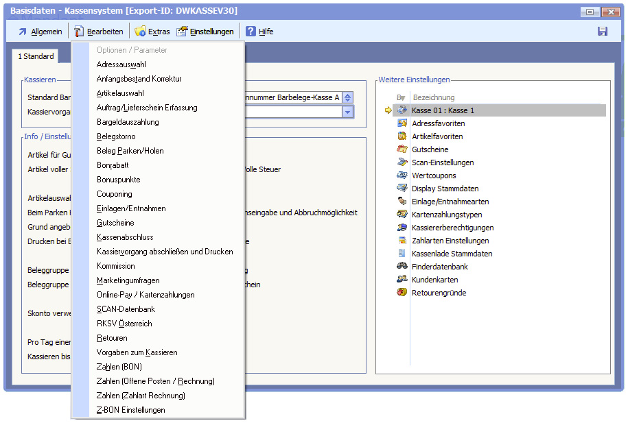 Im Menü "Bearbeiten" finden Sie die allgemein gültigen Einstellungen (für alle Kassen gültig).