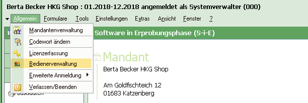 Öffnen Sie dann im Menü "Allgemein" die "Bedienerverwaltung".