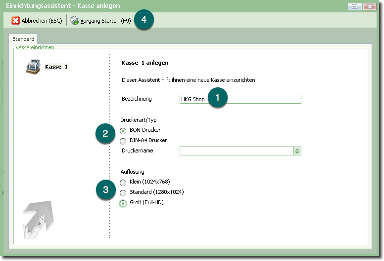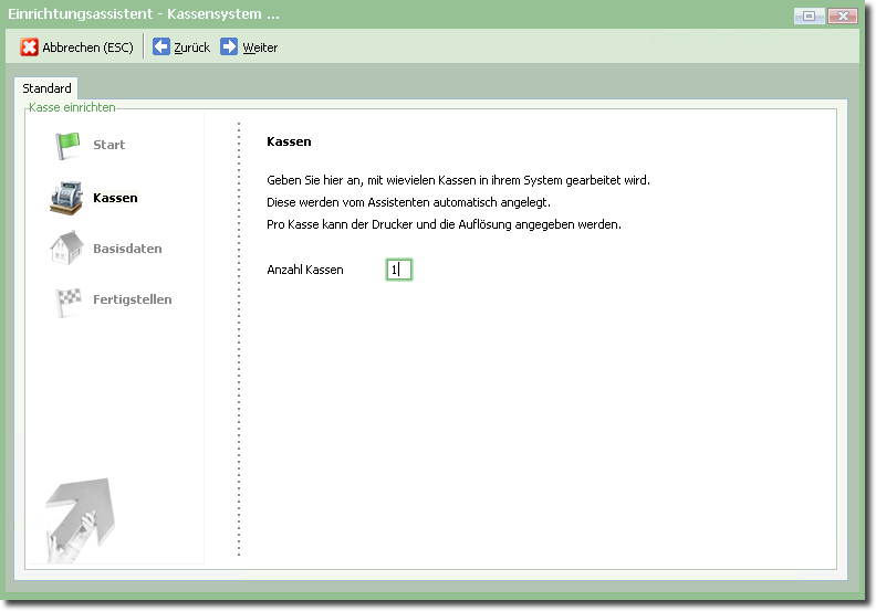 Dieser Assistent führt Sie durch die Kasseneinrichtung und legt ggf. "im Hintergrund" nötige Daten an.
