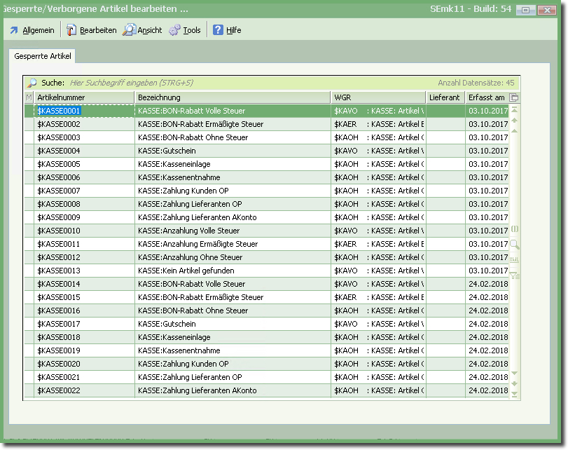 Ebenfalls notwendige Artikel sind in der Artikelübersicht nicht sichtbar, trotzdem aber angelegt und "verborgen".