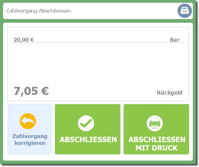 Das Rückgeld wird angezeigt und Sie können den Bon mit oder ohne Druck abschließen.