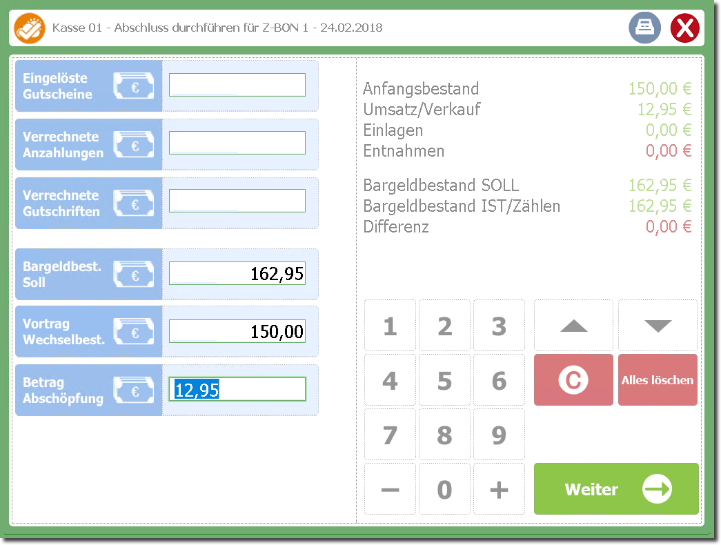 In der Abschluss-Maske kann der Wechselgeldbestand für den nächsten Tag eingetragen werden - der Abschöpfungsbetrag wird automatisch berechnet.