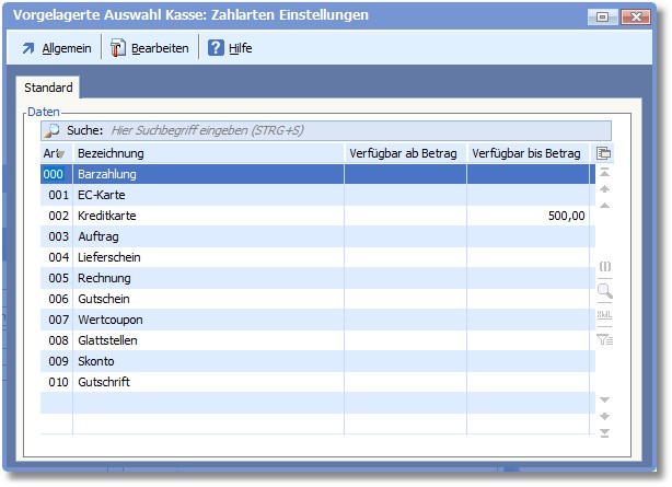 Verwaltung der Zahlarten die als Zahlung an der Kasse verwendet werden können.