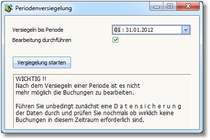 Versiegelt werden alle Perioden bis zu der in diesem Feld angegebenen Periode. Geben Sie also die Periode 3 an, so werden die Perioden 1, 2 und 3 versiegelt bzw. abgeschlossen.
