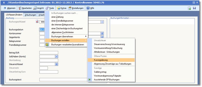 1. Wählen Sie in der Buchungsmaske den Menüpunkt "Tools > Buchung erstellen > Kursregulierung".