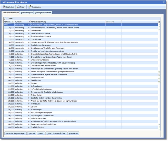 Dieses System stellt Informationen über die bebuchten Sachkonten bereit. Nach Aufruf dieses Bereiches öffnet sich die Auswahltabelle der Sachkonten.