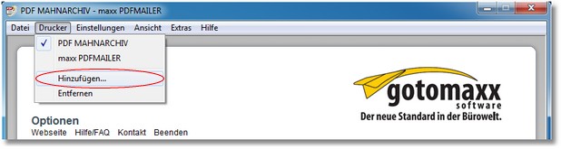 Klicken Sie dazu im PDFMAILER auf den Menüpunkt "Drucker -> Hinzufügen".