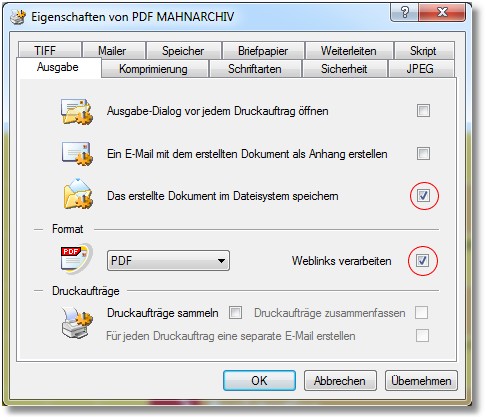 Aktivieren Sie in der Karteikarte "Ausgabe" die Optionen "Das erstellte Dokument im Dateisystem speichern" und "Weblinks verarbeiten".