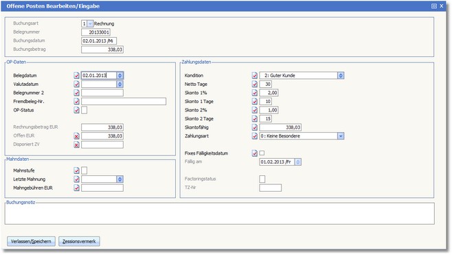 Mit [ALT]+[Z] können Sie einen Zessionsvermerk für den in der Tabelle markierten Beleg setzen.