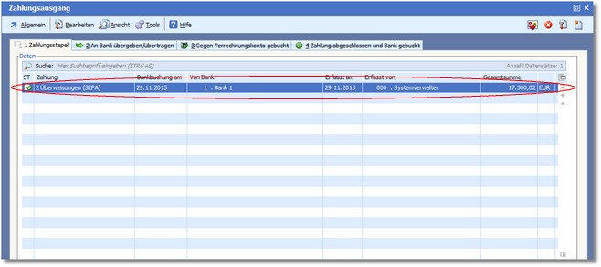 1.Markieren Sie den gewünschten Zahlungsstapel in der Auswahltabelle der Karteikarte "Zahlungsstapel" und drücken Sie [RETURN] oder öffnen Sie ihn mit einem Doppelklick.