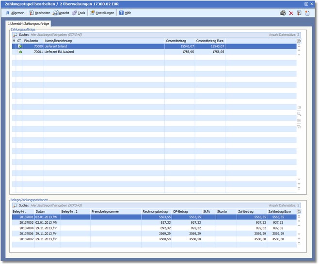 Hier werden die im Zahlungsstapel enthaltenen Überweisungsaufträge - für die einzelnen Lieferanten zusammengefasst - in einer Tabelle angezeigt.