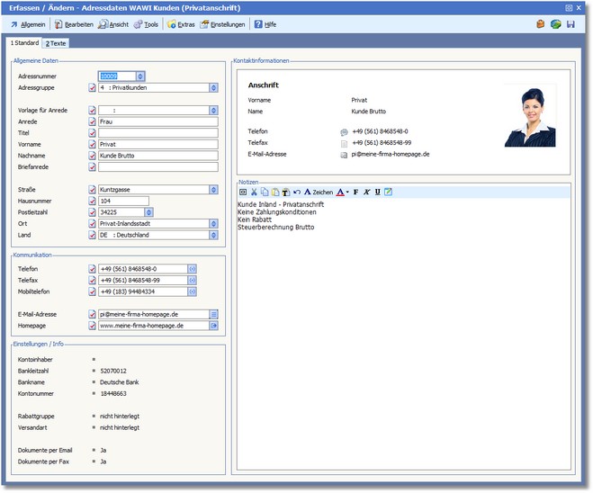 << Hier KLicken um eine Inhaltsübersicht anzuzeigen >> Navigation: Warenwirtschaft > Stammdaten > Adressstamm > Adressen erfassen/ändern > Die Karteikarte "Standard" (Privatanschrift) |