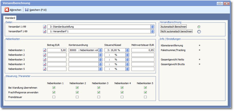 Bei automatischer Versandkosten- bzw. Versicherungsberechnung müssen Sie diese Versandkostenberechnung nicht gesondert aufrufen. Das Programm ermittelt die Versandkosten nach dem Verlassen der Positionserfassung selbsttätig.