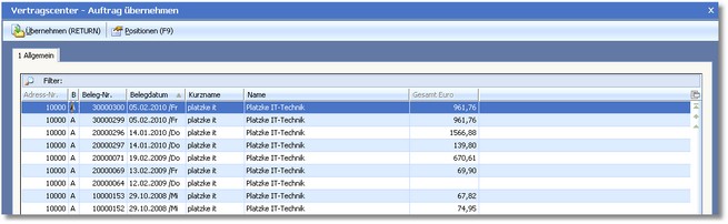 Einen Auftrag in einen Wartungs- oder Mietvertrag zu übernehmen bedeutet, dass das Programm zunächst im gewählten Auftrag prüft, für welche Artikel Wartungs- bzw. Mietartikel hinterlegt wurden (siehe: Artikelstamm > Wartungs-/Mietartikel). Das Programm übernimmt dann automatisch die Wartungs- bzw. Mietartikelpositionen dieser Artikel in den Vertrag und errechnet daraus die Wartungs- bzw. Mietentgelte.