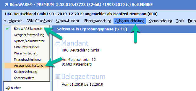 Für den Zugang zur Anlagenbuchhaltung aktivieren Sie das Menü "BüroWARE komplett" oder das Menü "Anlagenbuchhaltung".