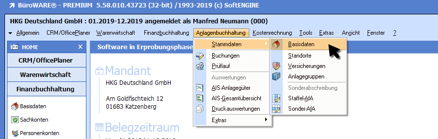 1. Wählen Sie im Menü der Anlagenbuchhaltung den Menüpunkt "Stammdaten > Basisdaten".