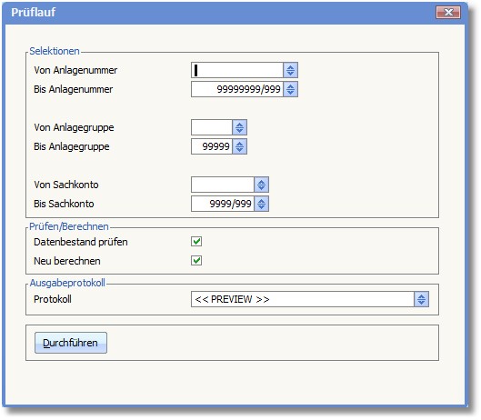 Der Prüflauf bietet die Möglichkeit der „maschinellen Kontrolle" der Anlagedaten. Maschinelle Kontrollen sind in Programmabläufe integrierte Prüfbedingungen, welche die Verarbeitung von nicht plausiblen und unvollständigen Daten verhindern sollen. In der Anlagenbuchhaltung erfüllt der Prüflauf folgende Aufgaben:
