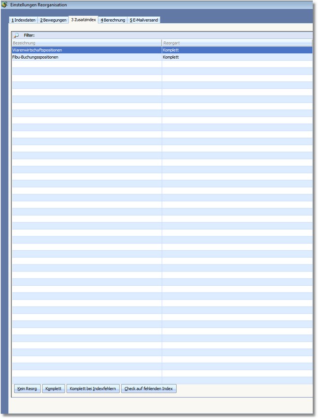 Für einige Bewegungsdaten (Positionen) werden neben den Verweisen auch Indexdateien angelegt (Zusatzindex). Hier können Sie die Reorganisation dieser Indexdateien einstellen.