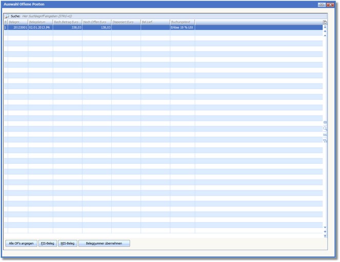 << Hier KLicken um eine Inhaltsübersicht anzuzeigen >> Navigation: Finanzbuchhaltung > Laufende Vorgänge > Stapelbuchungen > Die Karteikarte "Buchungen" > Buchen von Zahlungsein- und -ausgängen > Die Single-OP-Auswahltabelle |