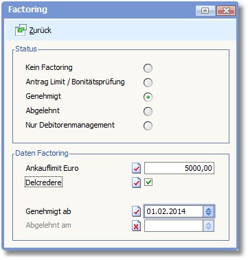 Bei jedem Kunden (Debitor), dessen OPs an den Factor weitergegeben werden, muss der Factoringstatus und das Ankauflimit in den Stammdaten der Warenwirtschaft hinterlegt werden.