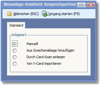 1. Wählen Sie im Adressstamm die Adresse aus, zu welcher Sie einen Ansprechpartner erfassen möchten und drücken Sie [RETURN]. 2. Klicken Sie mit der Maus auf den Menüpunkt "Bearbeiten > Neuen Ansprechpartner hinzufügen". Der Neuanlage-Assistent für Ansprechpartner wird geöffnet. 3. Legen Sie durch Aktivierung des entsprechenden Radiobuttons fest, auf welche Art und Weise der neue Ansprechpartner erfasst werden soll und drücken Sie [F9]. 4. Erfassen Sie die Daten in den vorgesehenen Feldern und speichern Sie den neuen Ansprechpartner mit der Funktionstaste [F10].