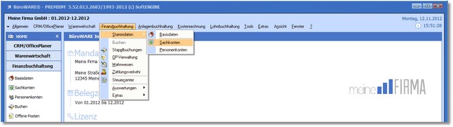 1.Klicken Sie mit der Maus im Hauptmenü auf "Finanzbuchhaltung > Stammdaten > Sachkonten".