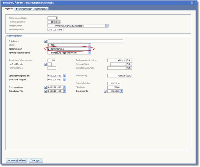 Das Programm öffnet den Dialog "Erfassen/Ändern" Teilzahlungsmanagement.