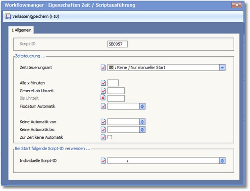 In diesem Feld wird die Script-ID zur Ausführung eines individuellen Workflowscripts hinterlegt. Mit der Funktionstaste [F5] gelangen Sie hier in die Auswahl Workflowscripte, wo Sie das entsprechende Script auswählen und mit [RETURN] in das Feld übernehmen können.