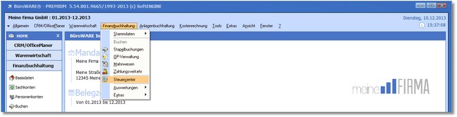 1.Klicken Sie mit der Maus im Hauptmenü auf "Finanzbuchhaltung > Steuercenter".