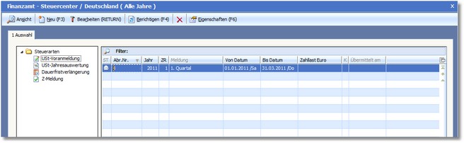 Über das Steuercenter können Sie Umsatzsteuervoranmeldungen, Umsatzsteuerjahresauswertungen und Dauerfristverlängerung erstellen sowie eine zusammenfassende Meldung erstellen.