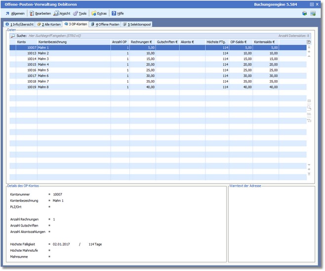 << Hier KLicken um eine Inhaltsübersicht anzuzeigen >> Navigation: Finanzbuchhaltung > Laufende Vorgänge > OP-Verwaltung > Karteikarte "OP-Konten" |