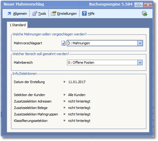 Parameter für Mahnvorschlag Öffnet eine Optionsmaske, in der Sie zusätzliche Einstellungen für den Mahnvorschlag hinterlegen können.