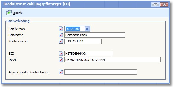 In diesem Dialogfenster können Sie bei Bedarf die Bankverbindung des Zahlungspflichtigen für diese Zahlung ändern: