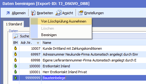 Hier können Datensätze von personenbezogenen Daten automatisiert „bereinigt“ werden. Beim Starten wird die letzte vorgegebene Selektion ausgeführt.